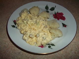 a co do sałatki:) jak już wiadomo 1 składnik to kalafiorek którego my uwielbiamy:) ogórek zielony groszek i kukurydza z puszki cebulka pokrojona na drobno i kilka ugotowanych ziemniaków pieprz ziołowy sól majonez:) może ktos zechce z Was zrobić:) sałatka była naprawdę dobra:)